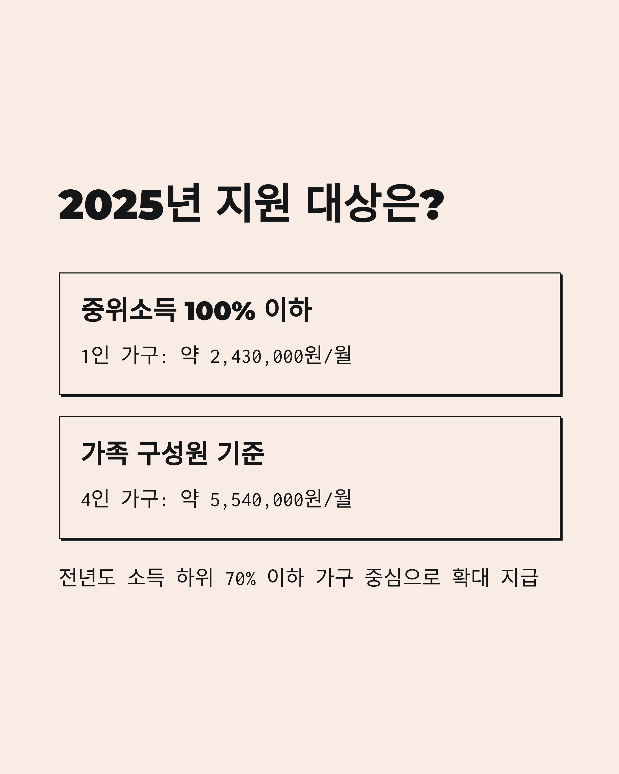 2025년에는 전년도 소득 하위 70% 이하 가구 중심으로 확대 지급되며,