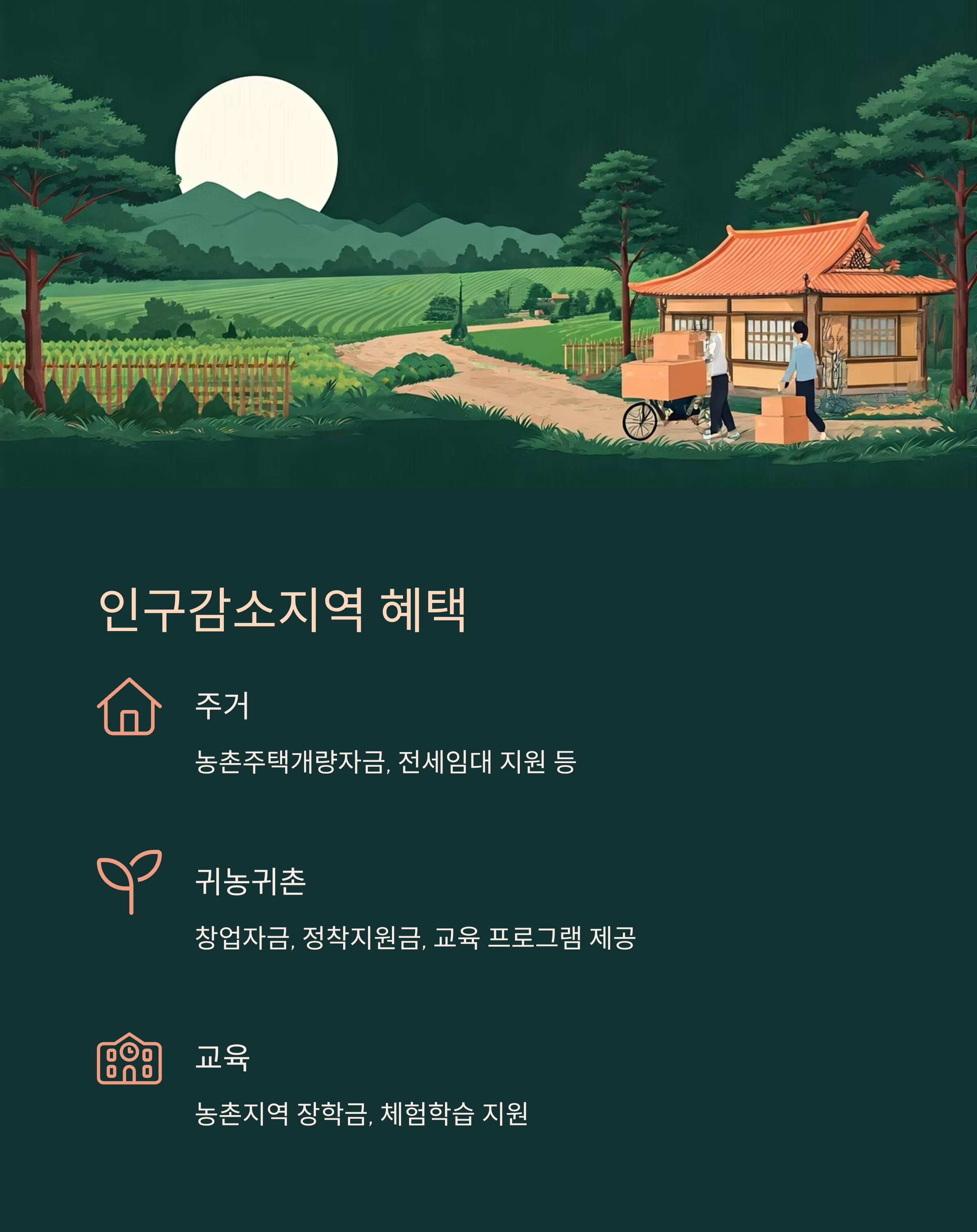 주택 구입·임차 지원, 귀촌 창업 자금, 지방세 감면, 교육 인프라 확충 등