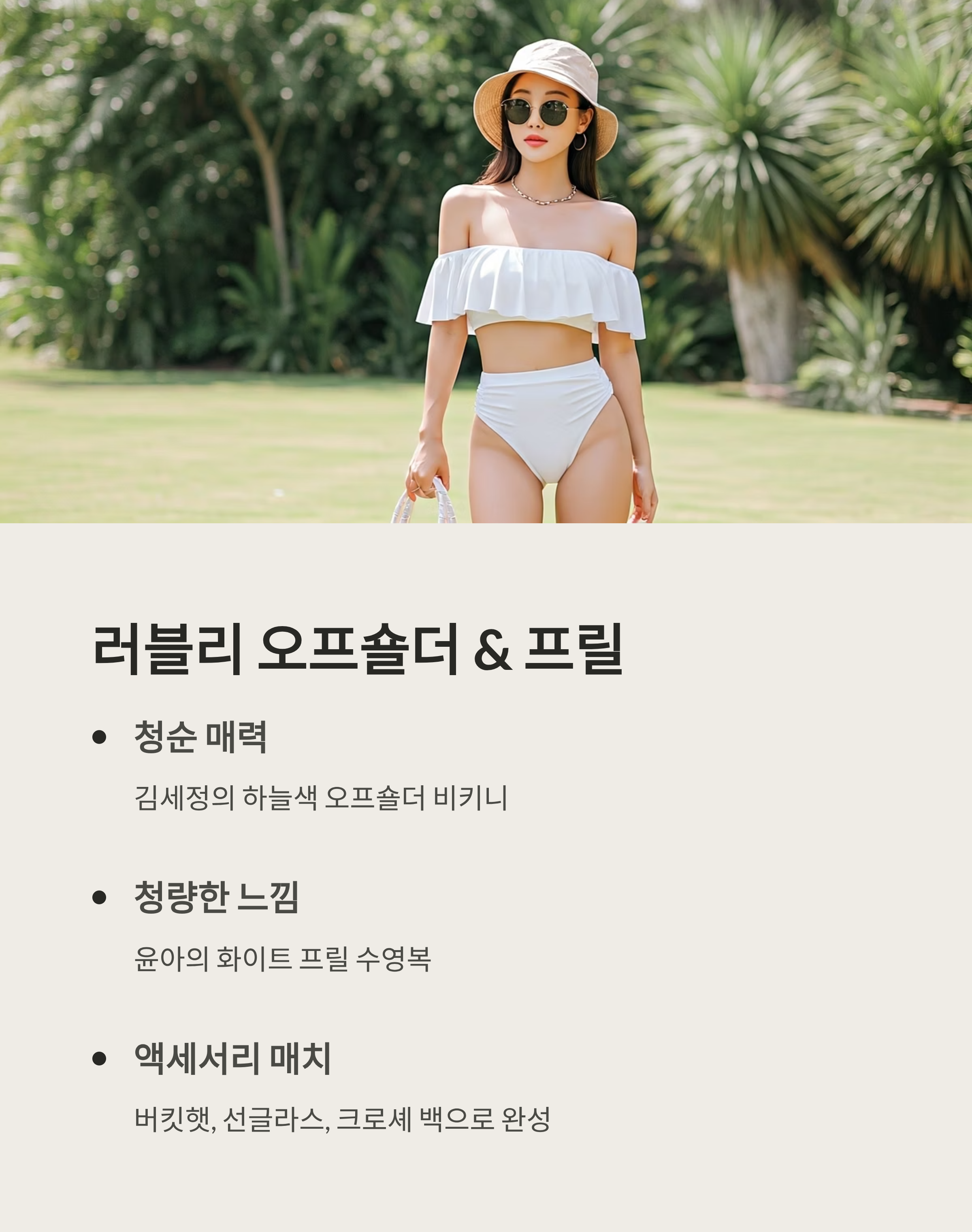 프릴 장식이나 오프숄더 디자인 수영복이 제격입니다.