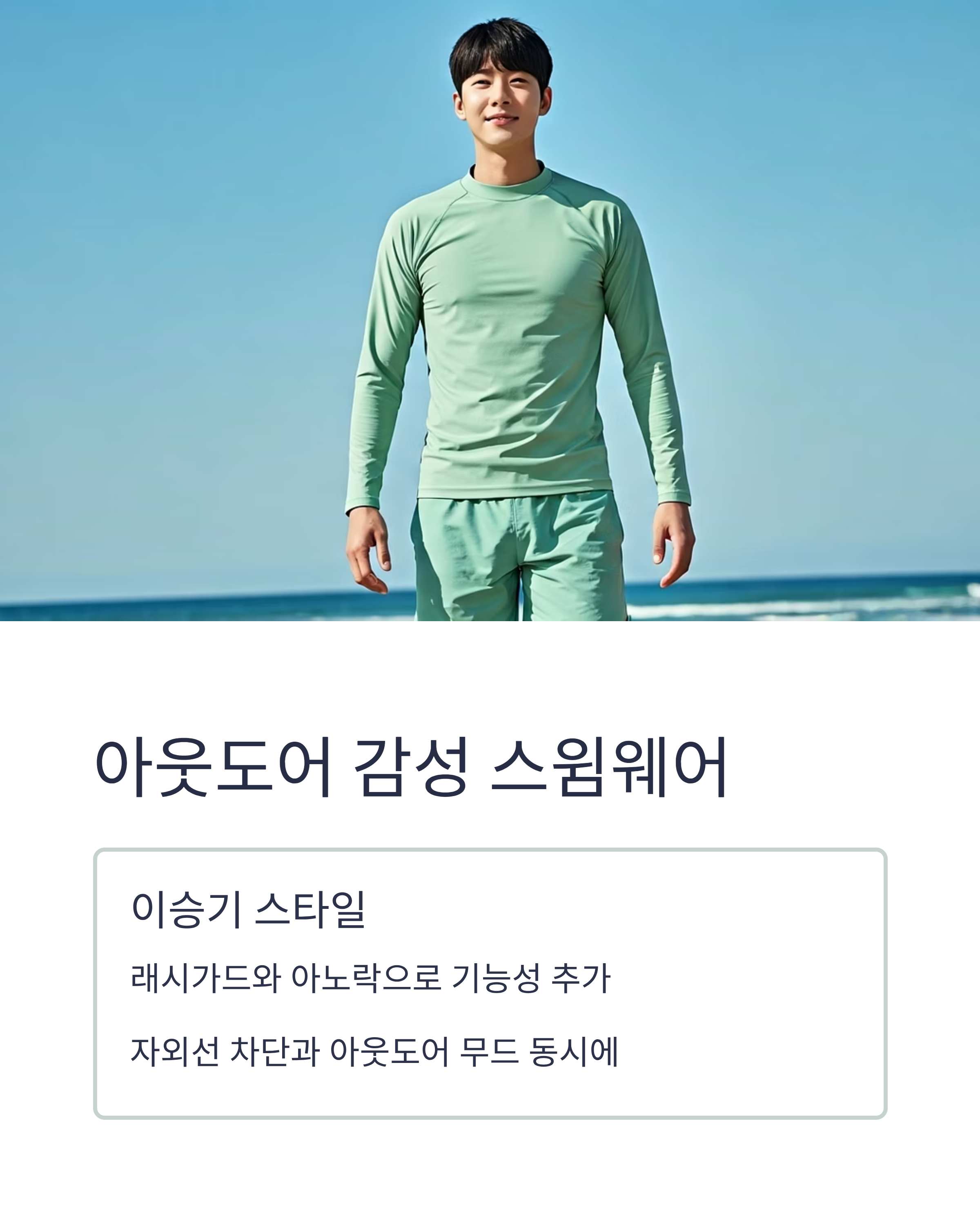 이승기는 수영복 위에 얇은 래시가드나 아노락 재킷을 함께 스타일링하는 경우가 많습니다.