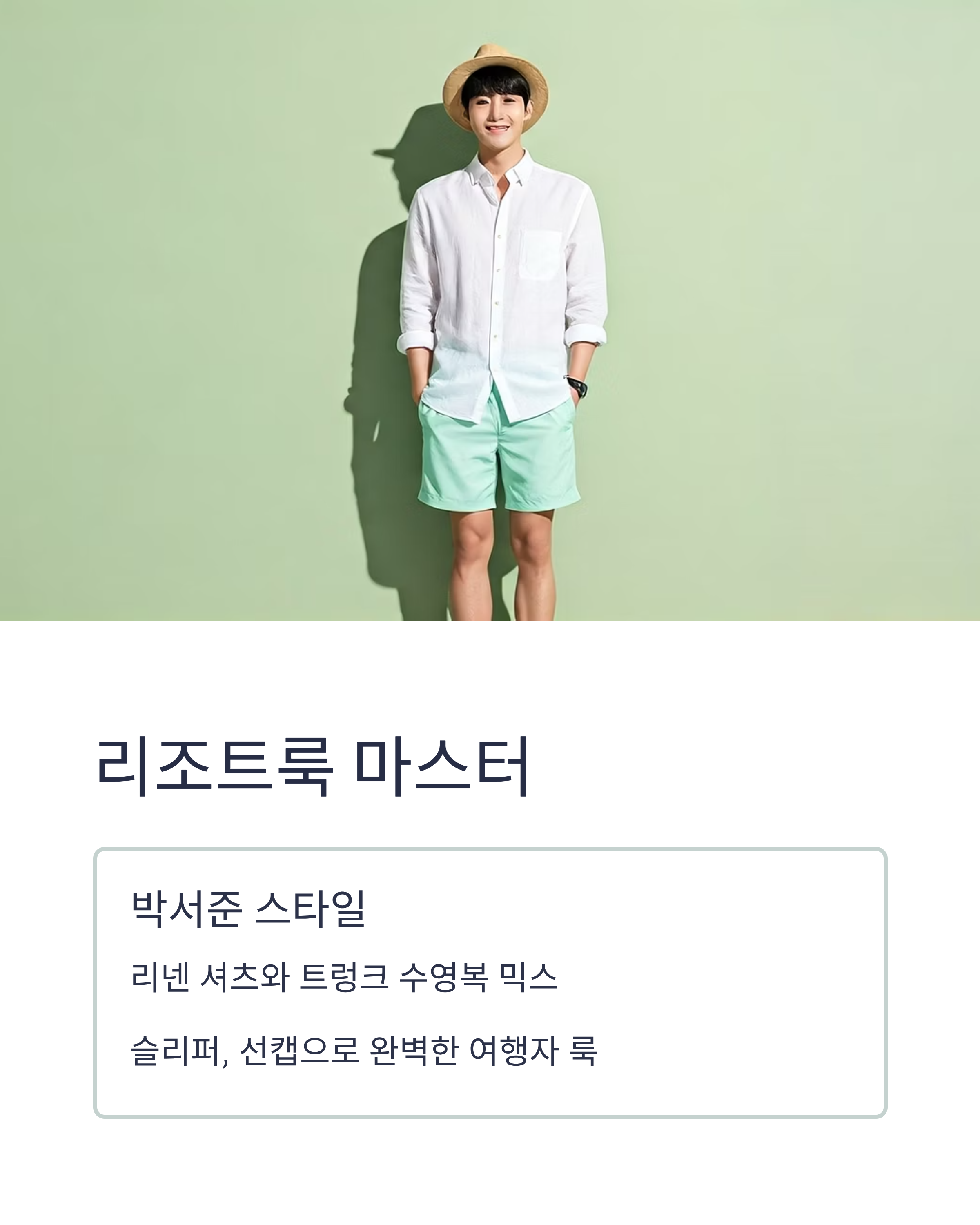 박서준은 리넨 셔츠와 트렁크 수영복을 믹스한 리조트룩이 인상적입니다.