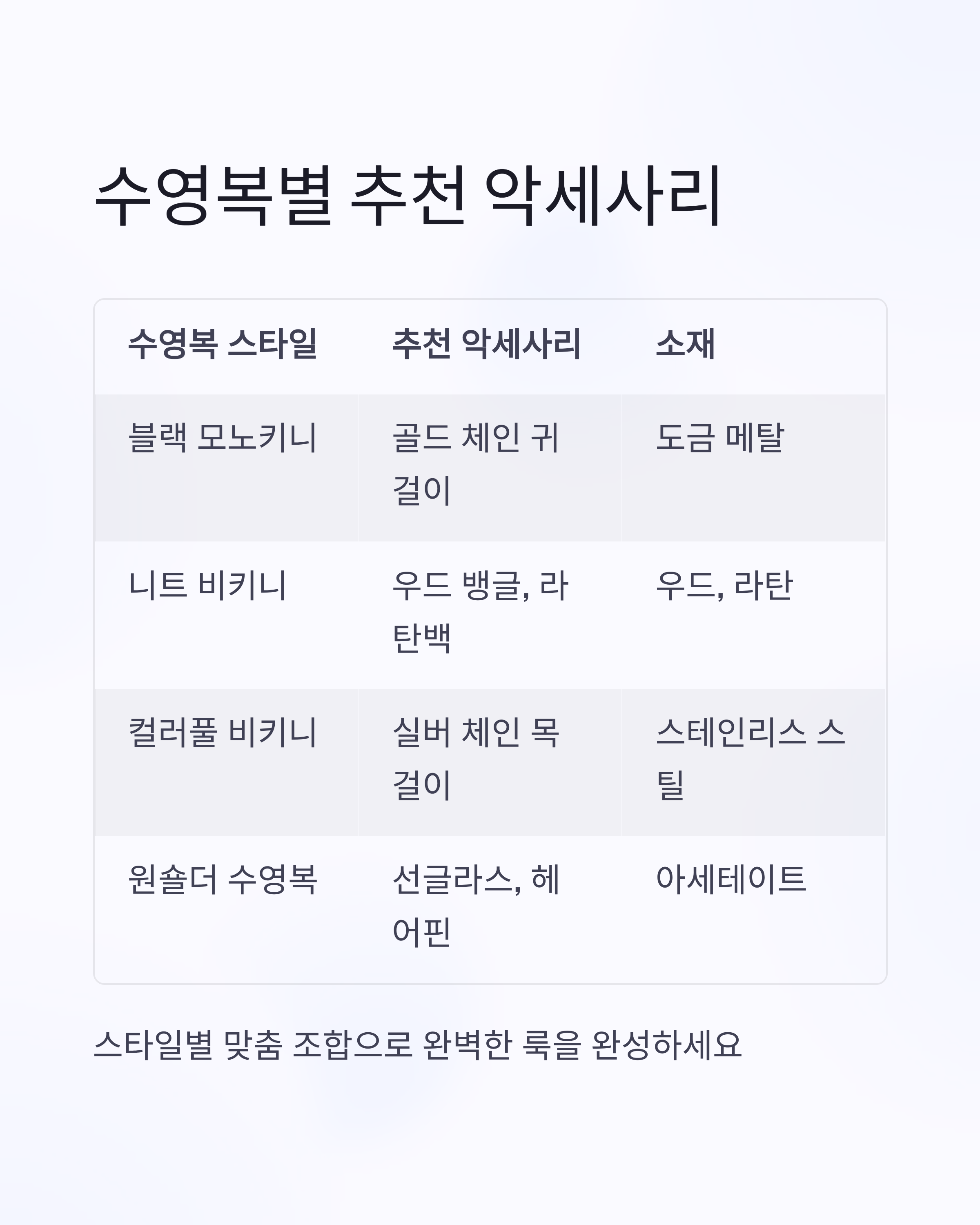 다음 표는 수영복 스타일에 따라 추천하는 악세사리 조합과