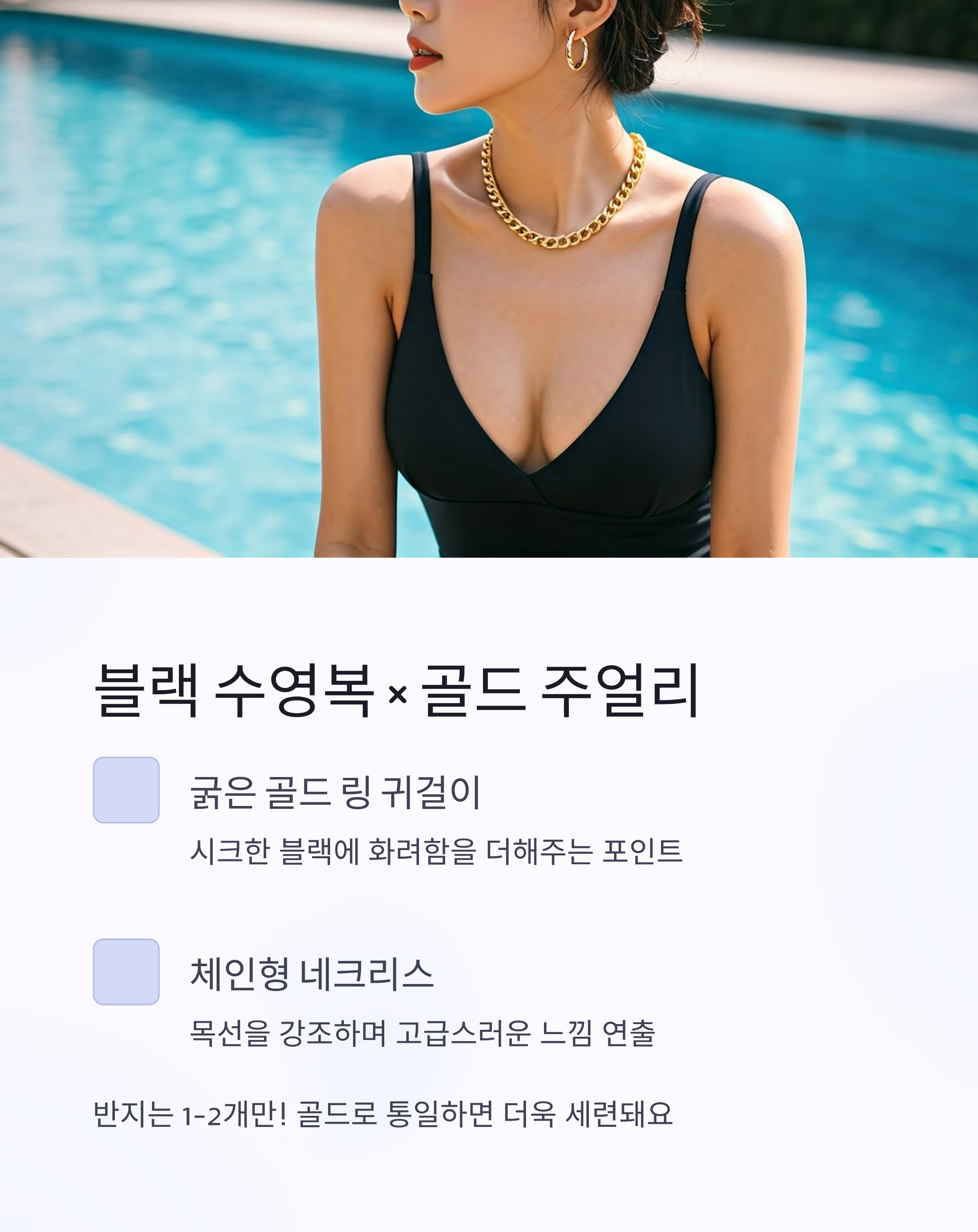 블랙 수영복엔 골드 주얼리로 포인트 주기