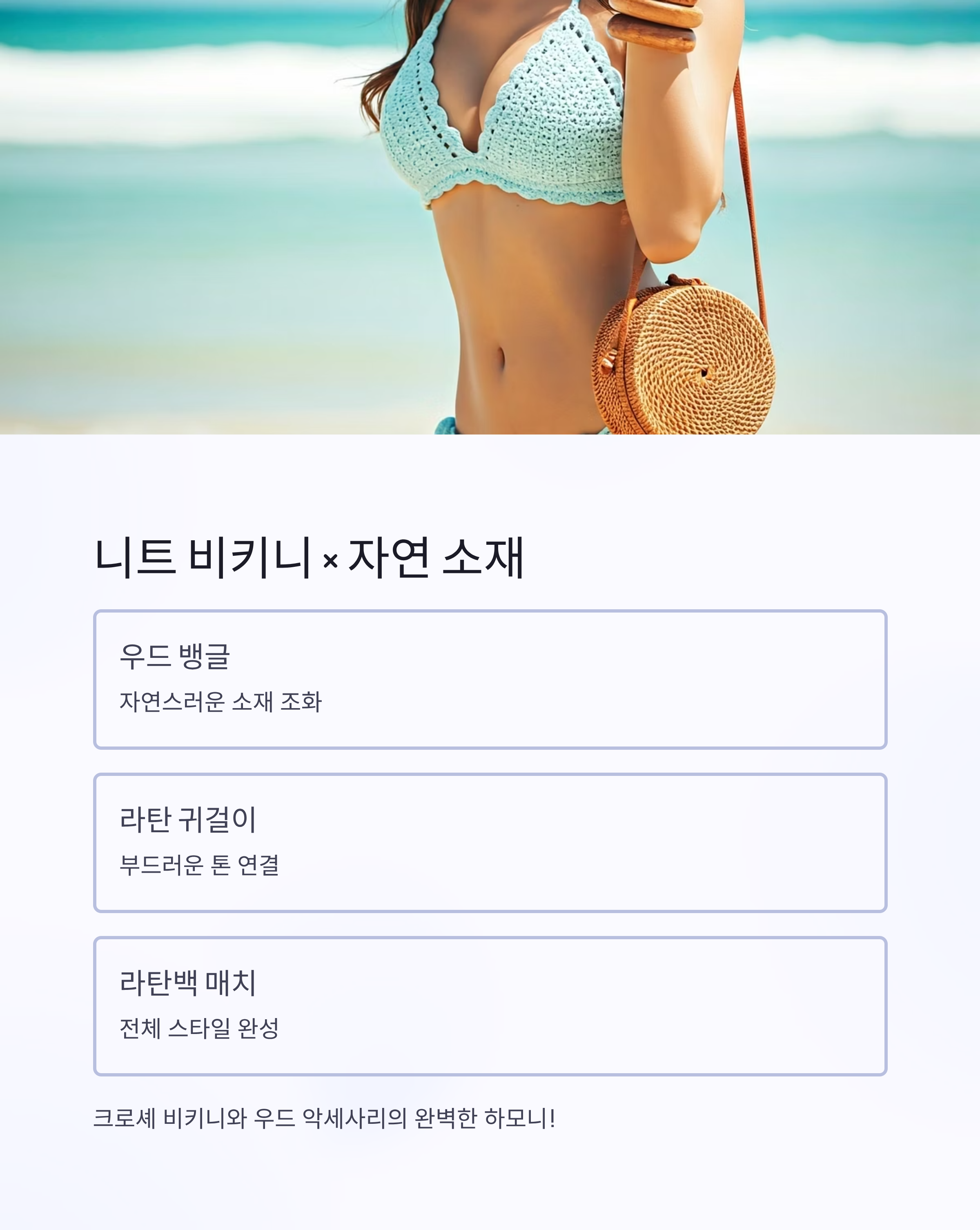 | 니트 비키니 | 우드 뱅글, 라탄백 | 우드, 라탄 |